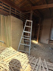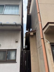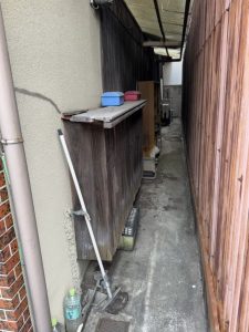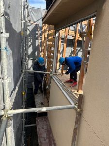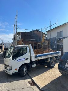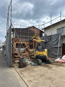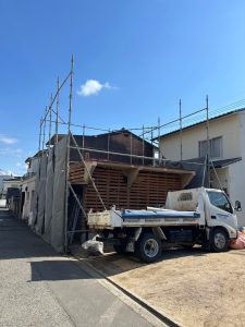残置物の撤去・片付け後、騒音や粉塵の飛散を最小限に抑えるため、家全体をしっかりと養生シートで囲います。安全第一の土台作りです。