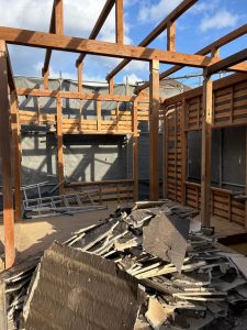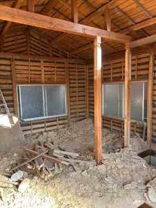 重機を入れる前に、まずは手作業で内装を解体、熟練のオペレーターが、周辺の建物に影響が出ないよう細心の注意を払いながら解体していきます。