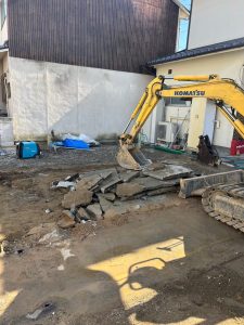 建物が無くなった後は、地面の下に隠れているコンクリート土間や基礎をきれいに取り除きます。 最後に地面を美しい「更地」へと仕上げていきます。