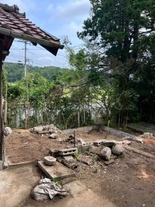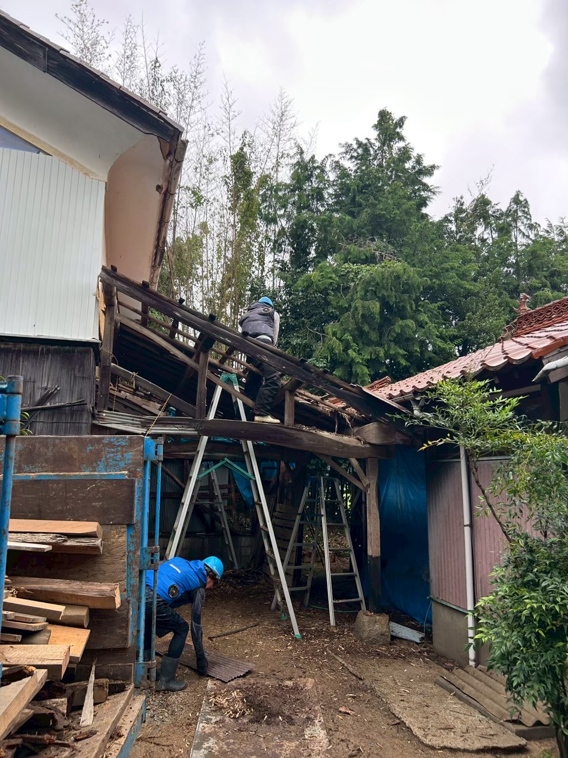 本日は、小屋の解体工事の様子を少しだけご紹介します。 建物同士が密着しているため、慎重な手壊し作業が求められる現場です。